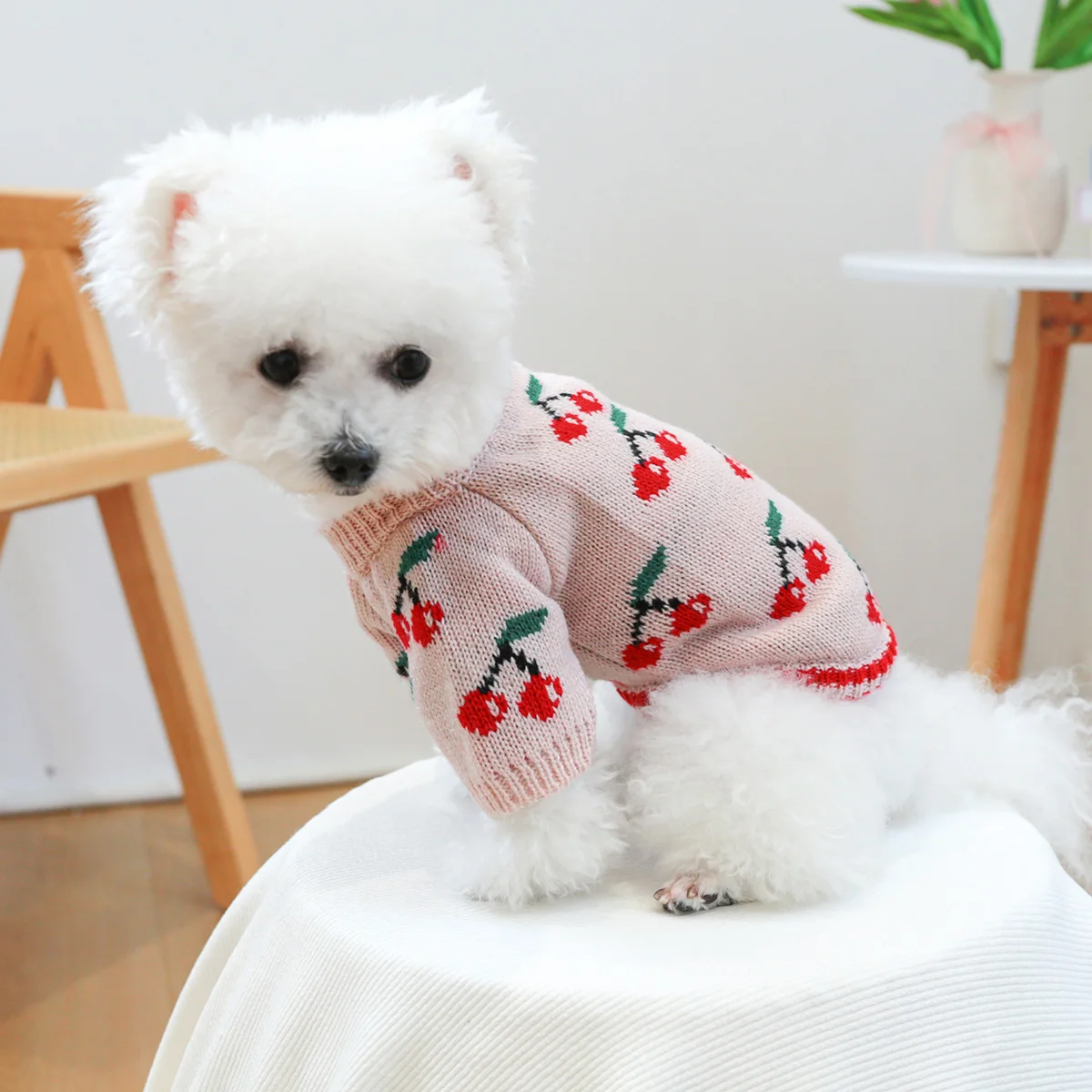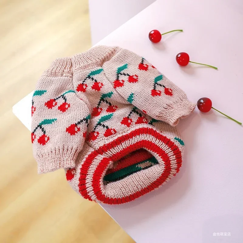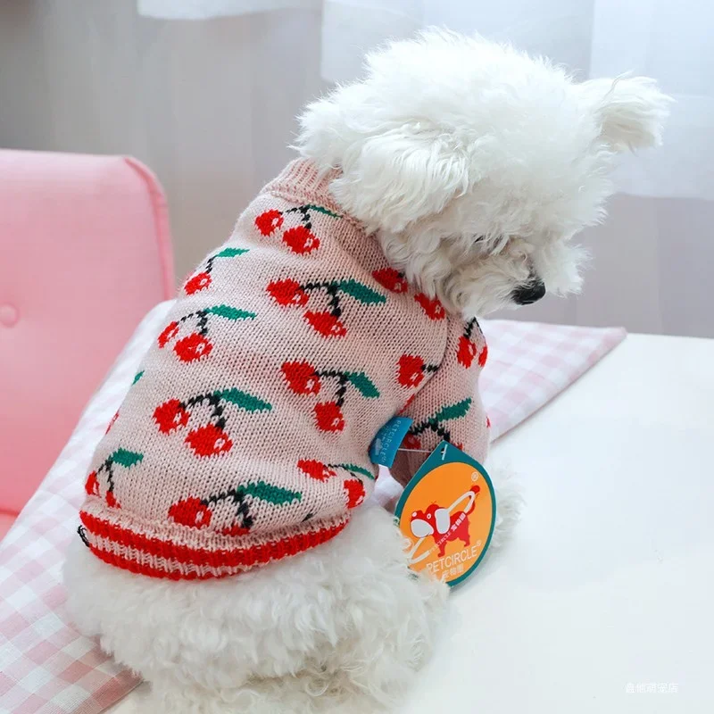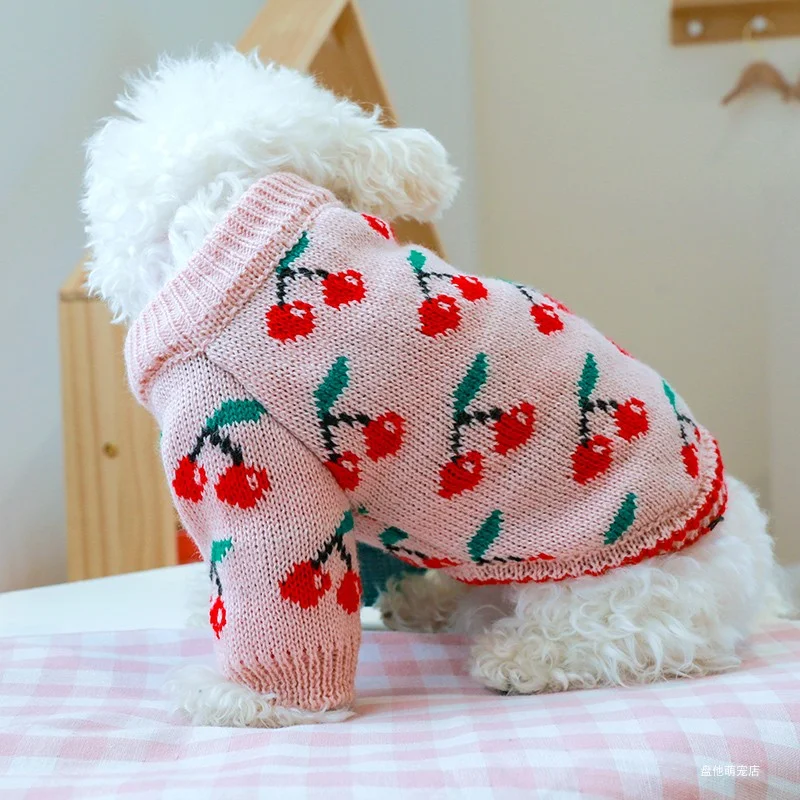1PC Pet Clothes Dog Cat Thickened Warm Winter Autumn Pink Cherry Sweater Elastic Jumper Knitted Sweater