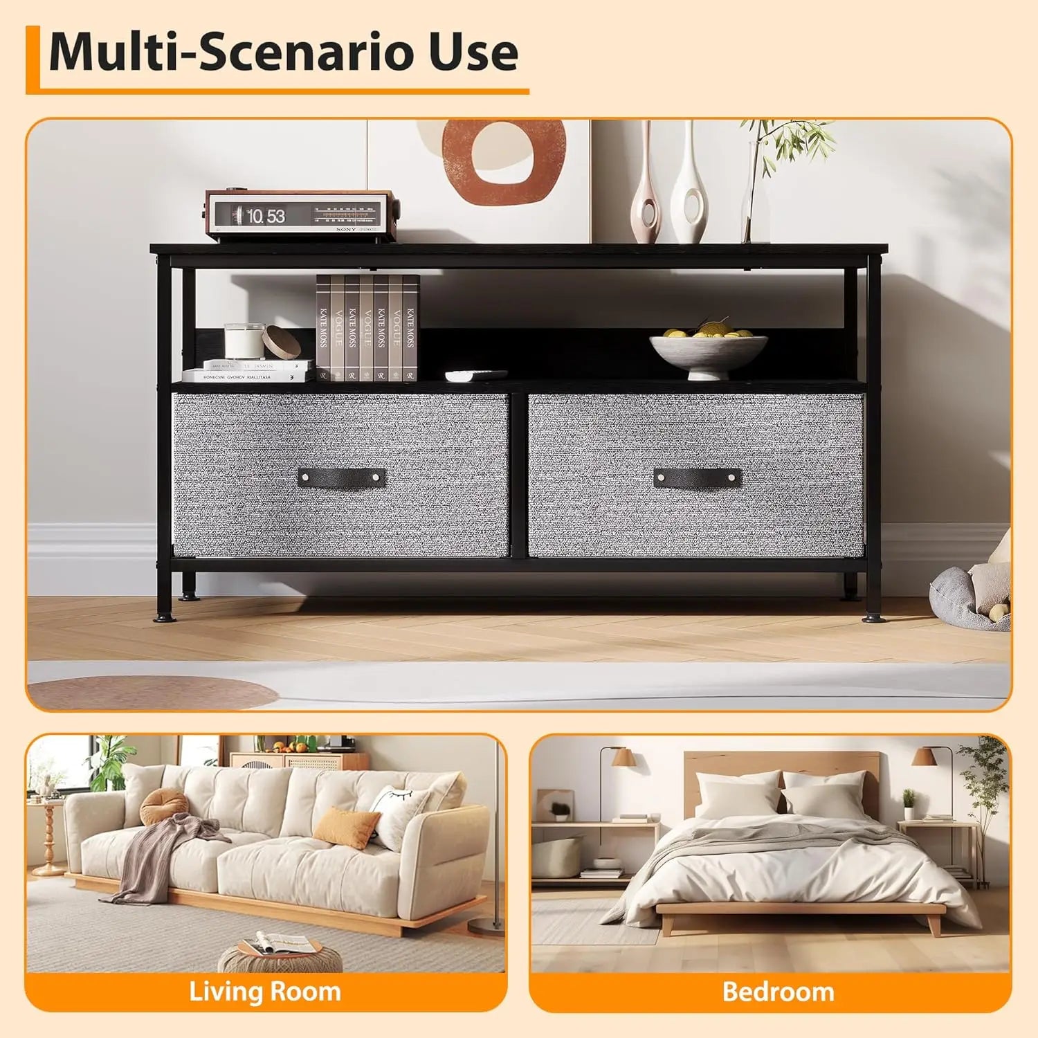 - Generous storage for living room media: Measuring 38.9" × 11.8" × 22.4", it fits TVs up to 50 inches and includes a central 9.1 inch high compartment plus two drawers for private storage.