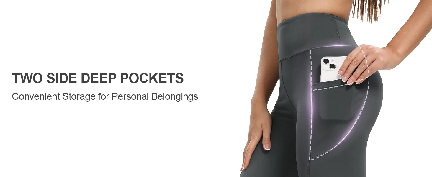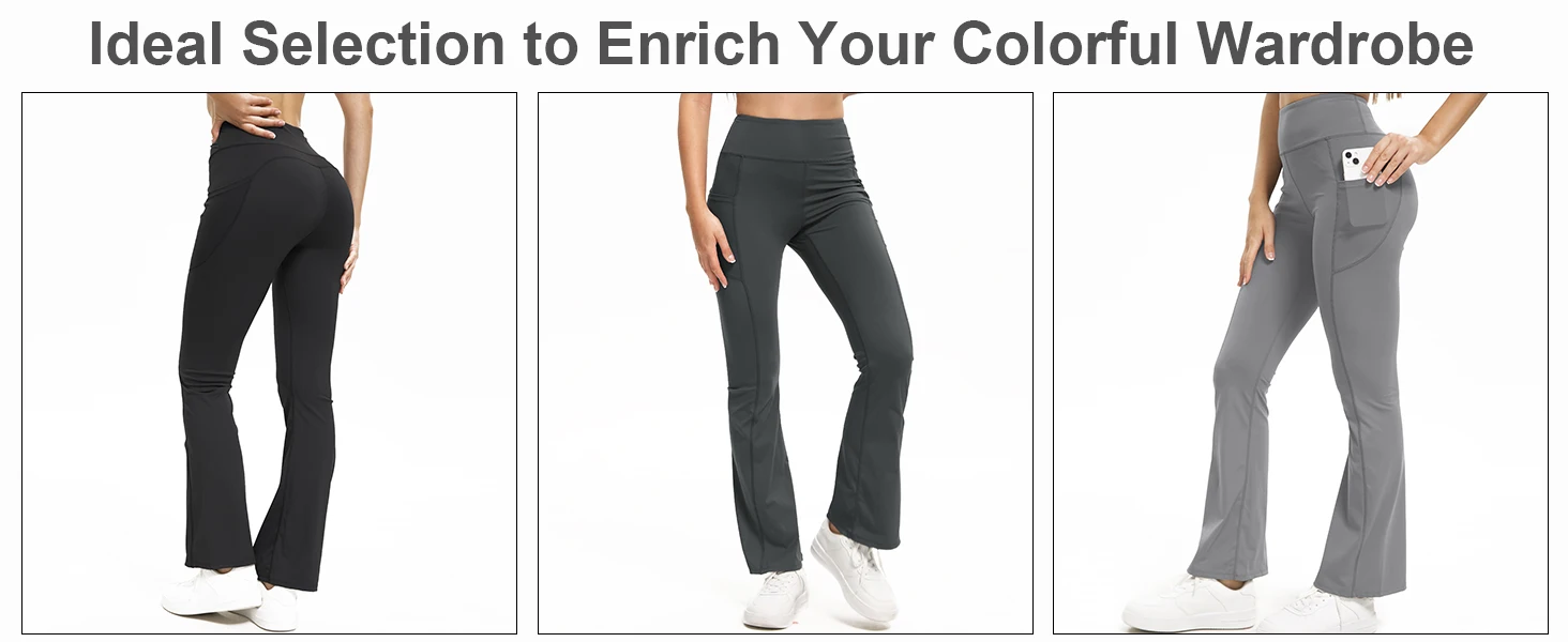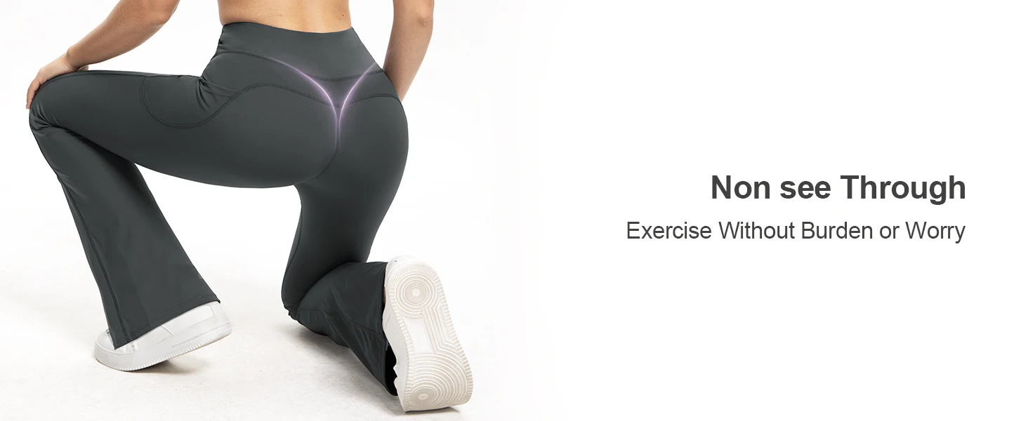 Deep side pocket:The workout flare yoga trousers have pockets on both sides so you can carry your mobile phone, cash, wallet, cards, keys and other items with you during your outdoor workout.The pockets are deep enough so you don't have to worry about your belongings slipping out of them, which greatly enhances your workout experience.