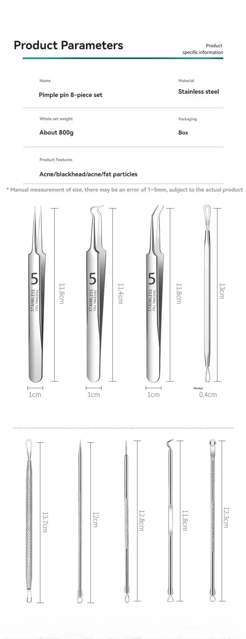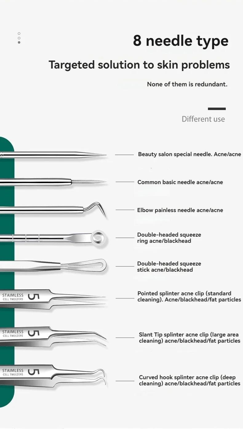 • Versatile Set :This 8-piece set includes a variety of acne-related tools, including acne clips, blackhead clips, and acne needles, catering to all your acne care needs.