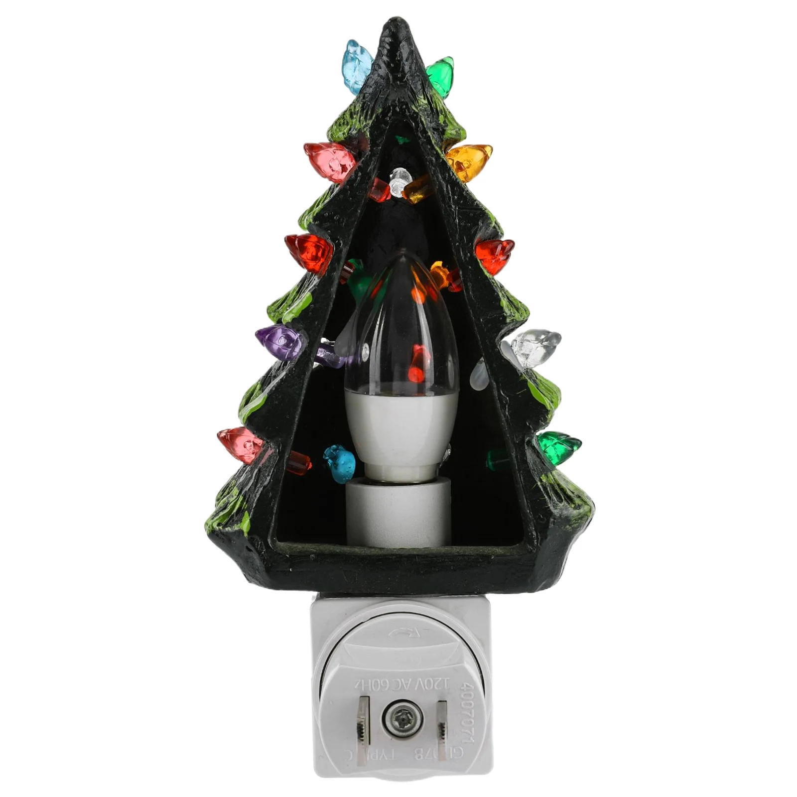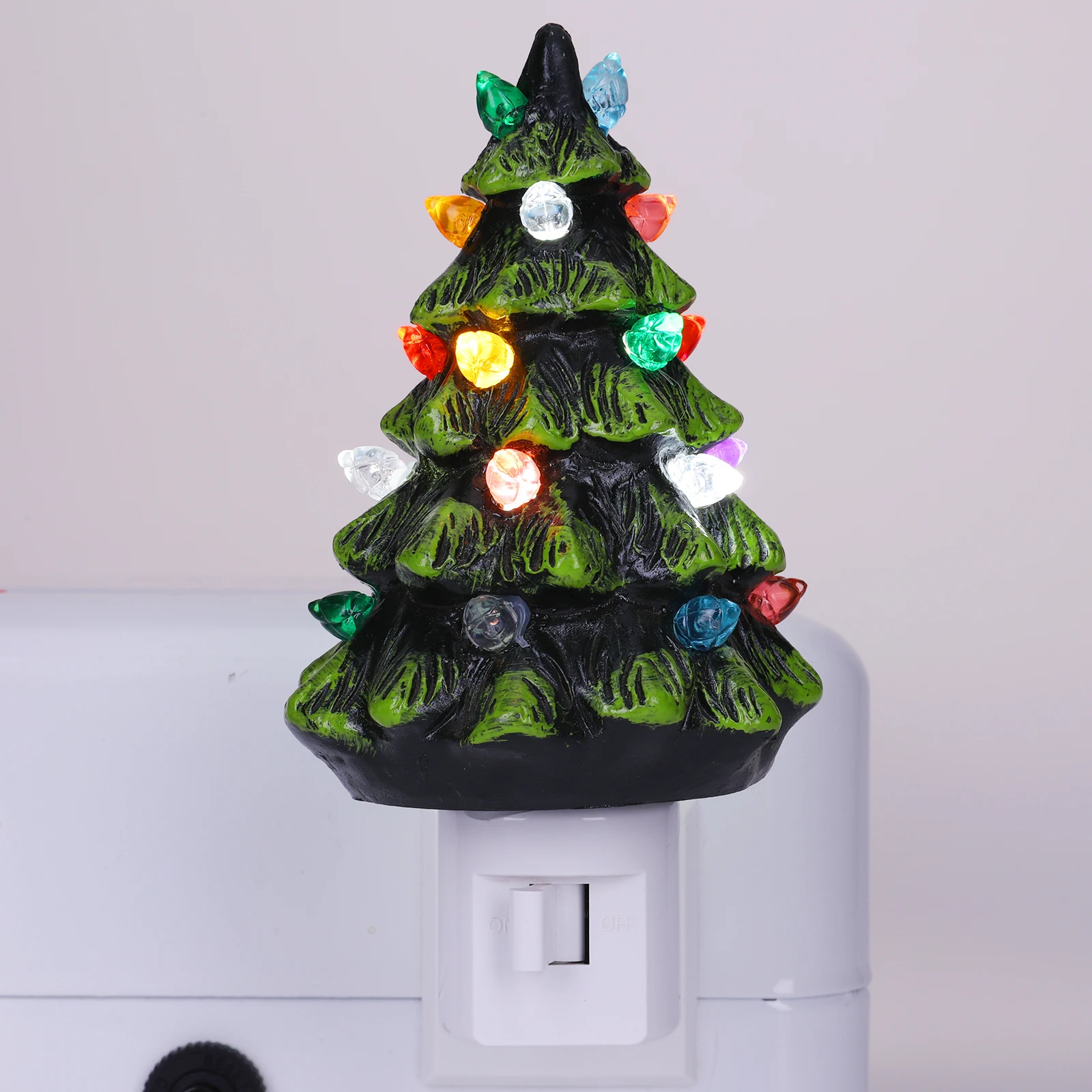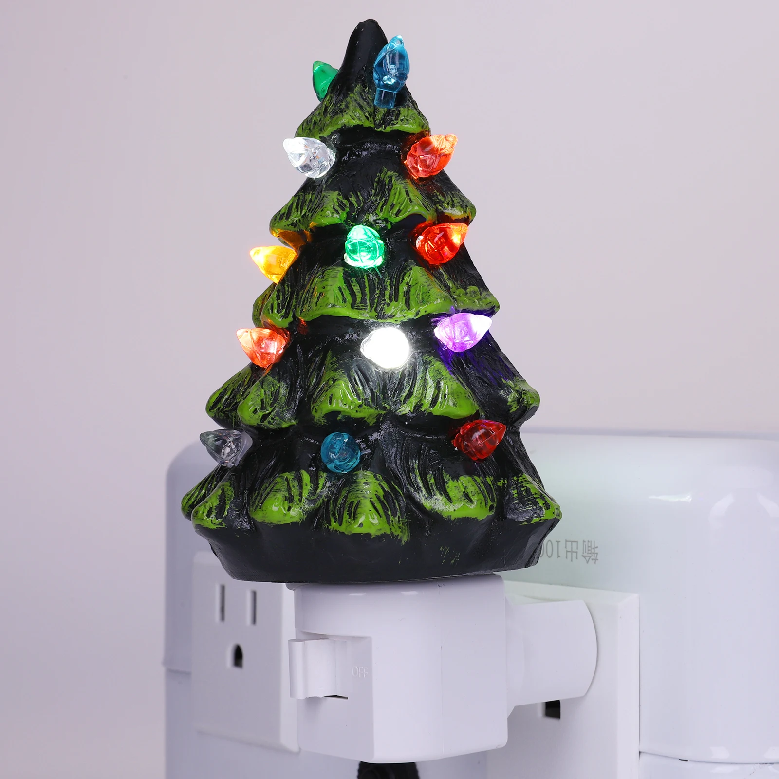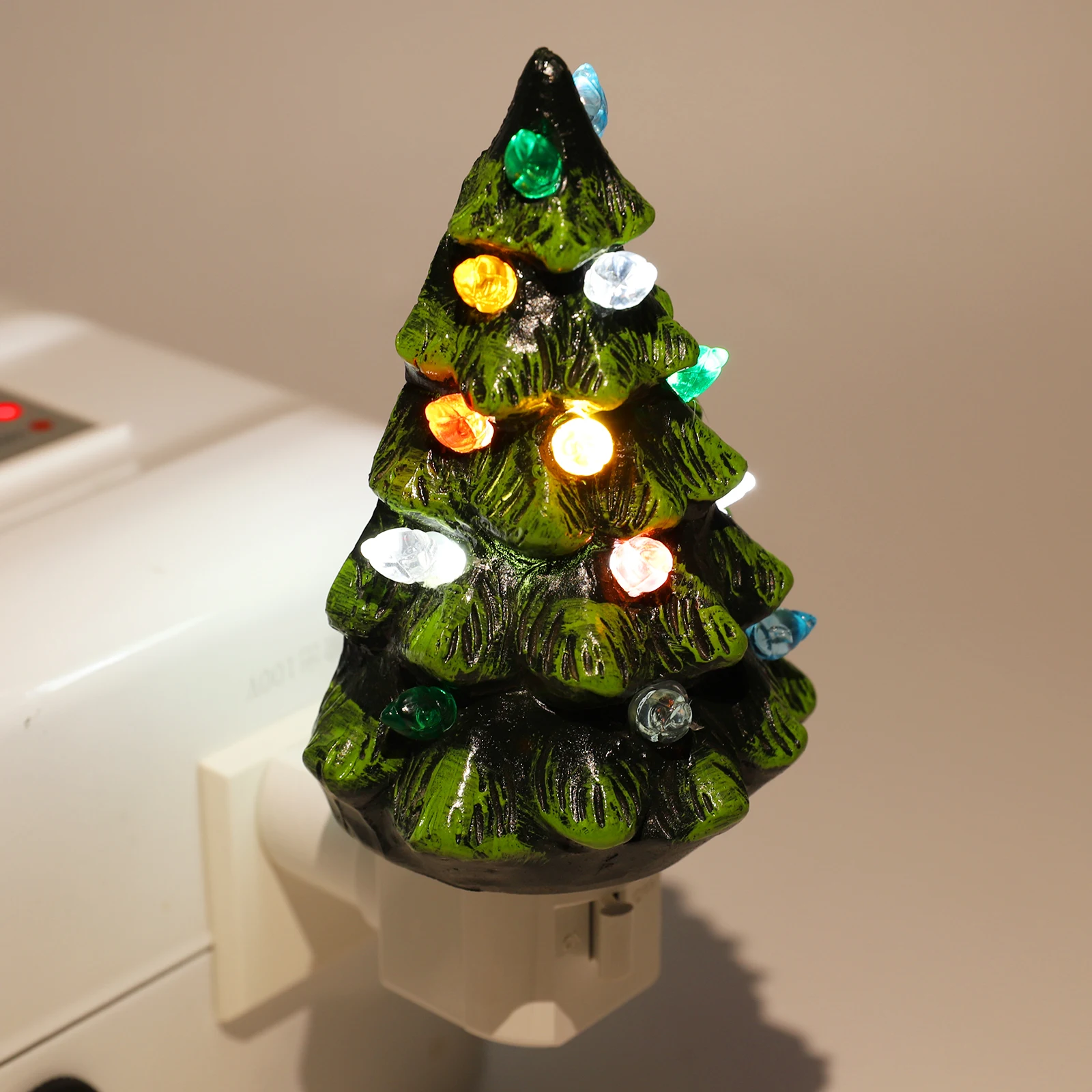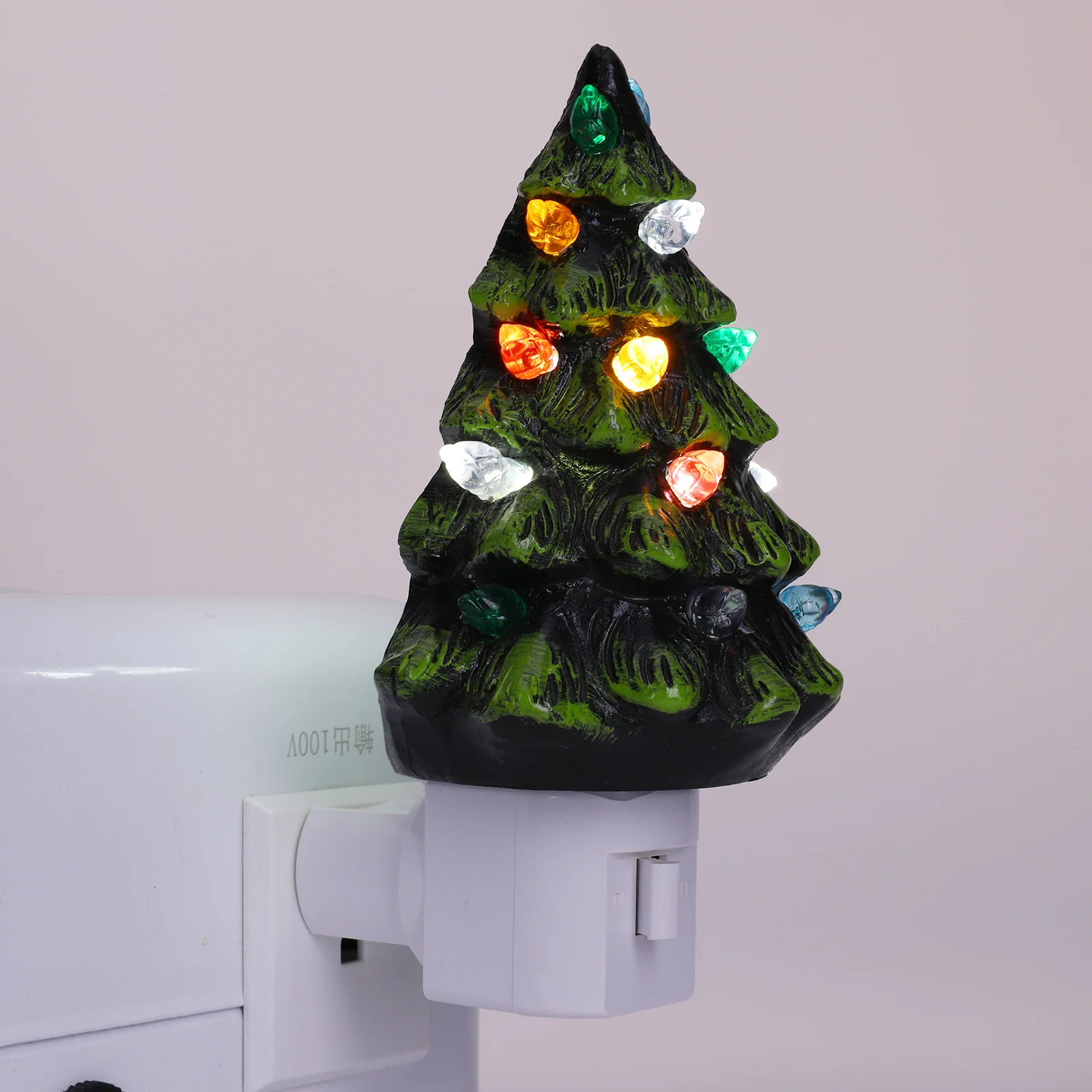 | Resin Christmas Tree Night Light 360 Degree Swivel Plug Wall Plug in Night Light Hand Painted Resin Vintage Night Light for Kitchen Bedroom Bedside Lamp Features: 1.Resin Christmas Tree Night Light: This charming Christmas tree night light is crafted from stable materials and hand-painted with a smooth surface. Its sturdy design is both safe and long-lasting, ensuring every night is filled with starlight. 2.Pleasing Bright Glow: The classic Christmas tree wall plug in night light projects a bright glow through the large transparent bulb in the center. When lit, the colorful bulbs emit a beautiful shine, adding a highlight to your home and complementing any room. 3.Switch & Rotating Plug: For convenience, this LED wall lamps night light features a pre-installed switch, eliminating the need for frequent plugging and unplugging. The wall lights plug rotates 360 degrees to accommodate different directions, fitting most US standard sockets. 4.Illuminate the Holiday Season: Standing approximately 14.7cm tall, this beautiful resin vintage night light is for creating a cozy Christmas atmosphere in dim hallways, countertops, work surfaces, bedrooms, or bathrooms. It can also decorate holiday walls, living rooms, dining areas, porches, or offices. 5.Cute Christmas & Valentine's Gift: This Christmas tree night light set adds a joyful touch to your holiday decorations and makes an excellent Christmas gift for children, family, friends, and colleagues. Specification: Note: Due to different monitor settings and lighting conditions, the actual color of the item may vary slightly from the pictures. Thanks for your understanding! Please allow a 1-2 cm difference in measurements due to manual measuring. 1 x Christmas Tree Night Light |
