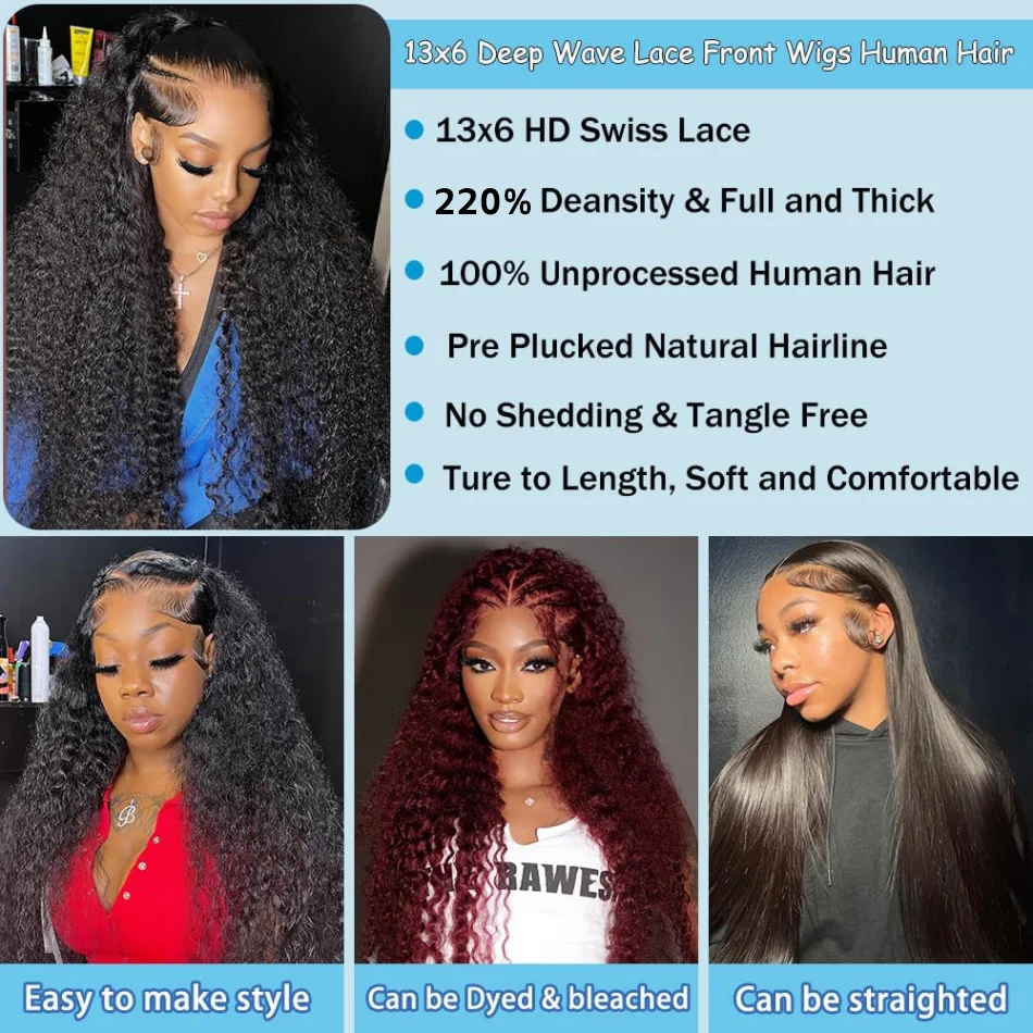 ❤Deep Wave Lace Front Wigs Human Hair Material: Deep Wave Wig Human Hair Made By Brazilian Human Hair Lace Front Wigs, Cut From Young Donors, Features A Deep Curly Wave Pattern With 220 Density, At Low Maintanance, Can Be Dyed, Restyled, Bleached