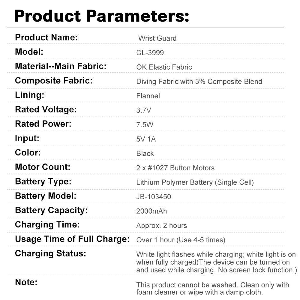 1.The electric heating wrist guard features 5 adjustable infrared heat compress settings (40°C, 45°C, 50°C, 55°C, and 60°C) to effectively soothe wrist . It is useful for tendonitis and overworked hands.