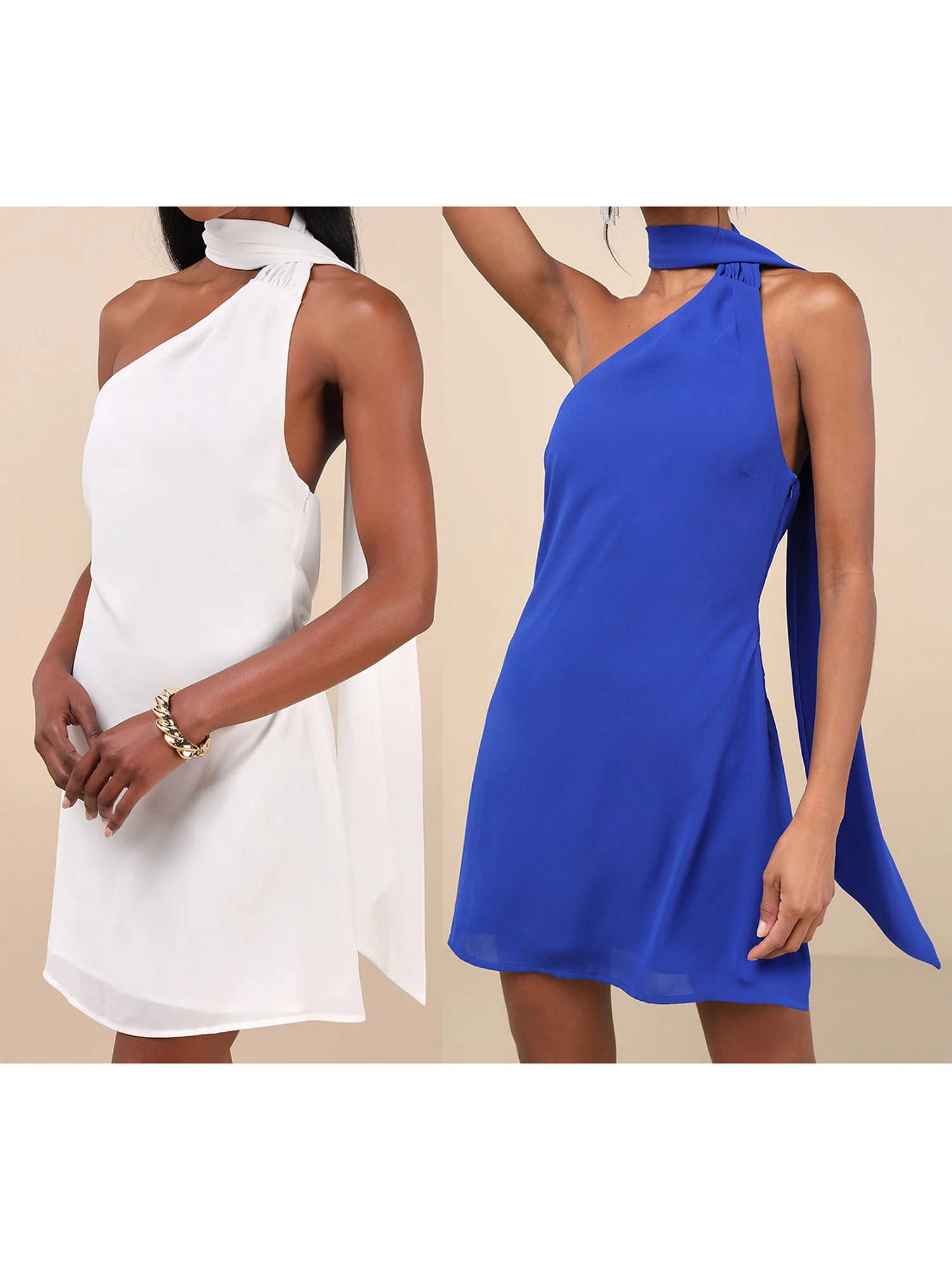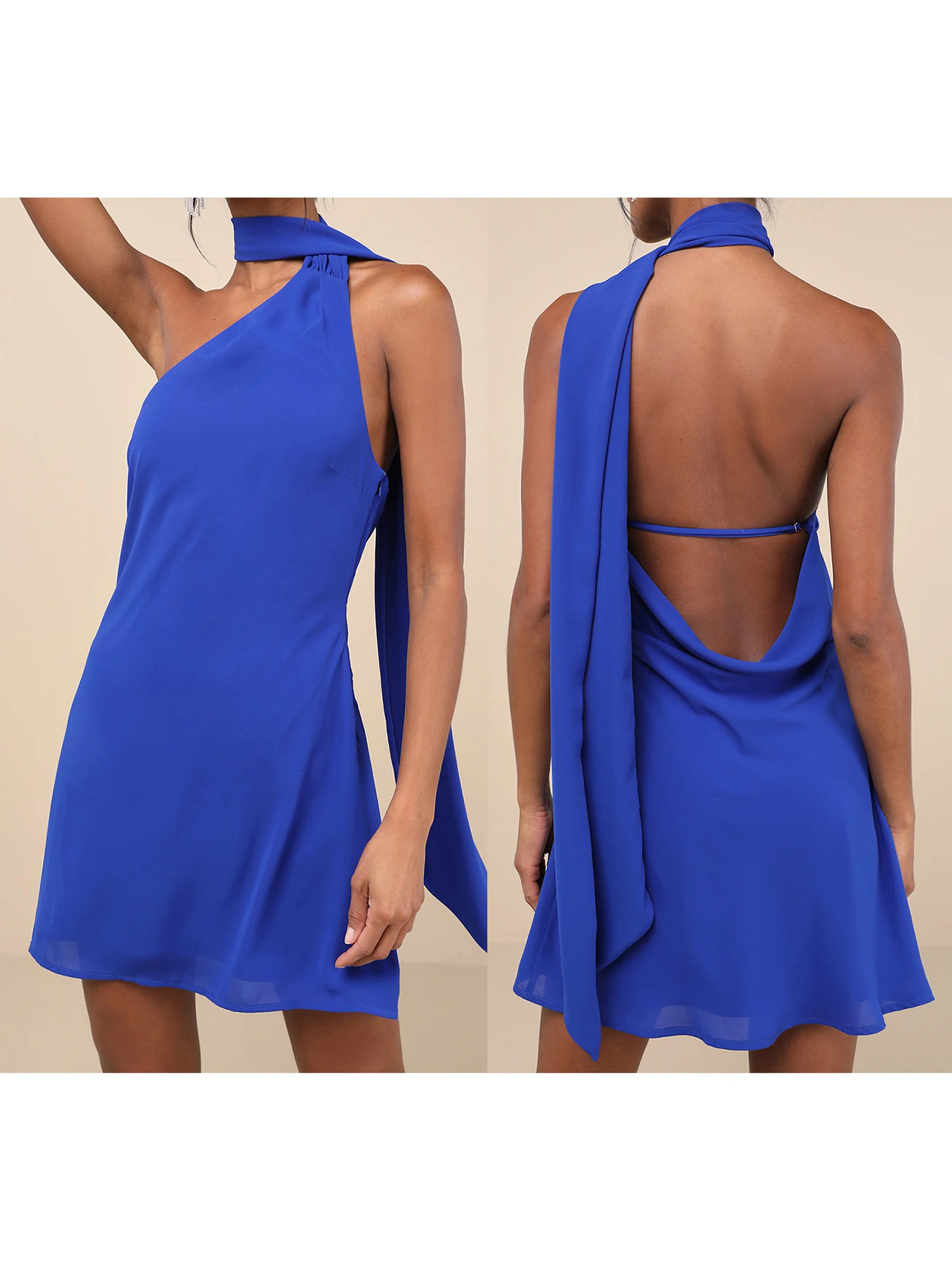 Women's Halter Neck Dress Sleeveless Open Back Solid Color Mini Dress Clubbing Dress with ScarfFeatures: