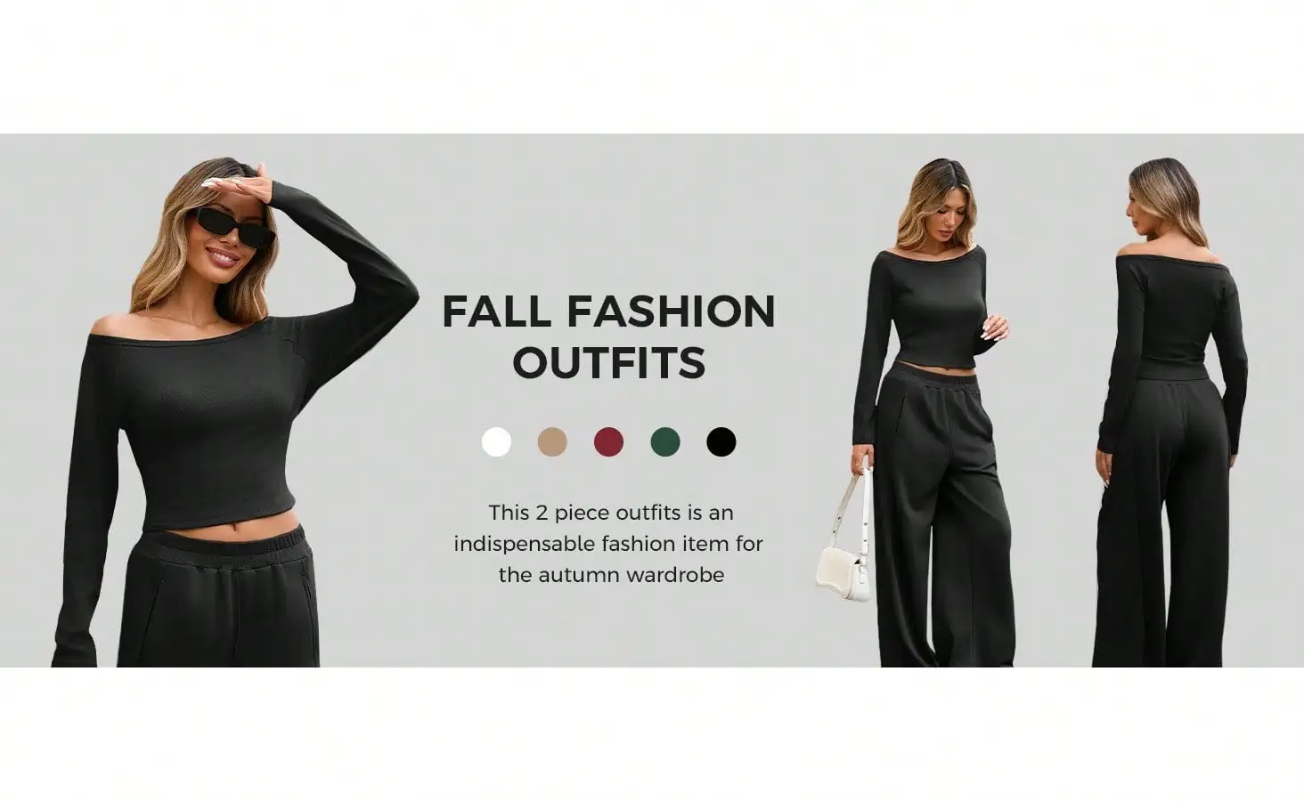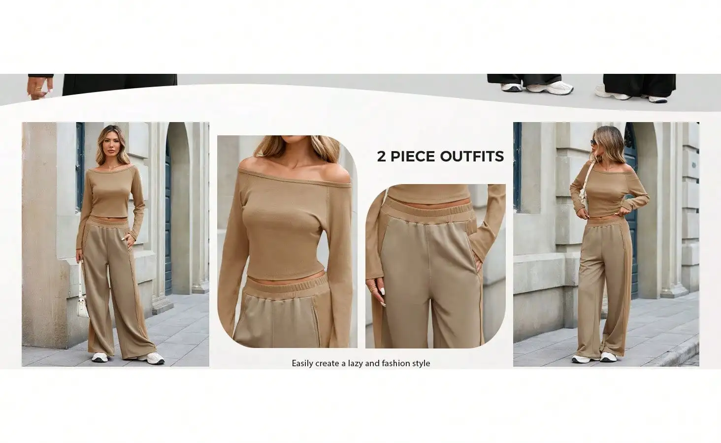 Fisoew Women Two Piece Set Off Shoulder Crop Top Wide Leg Pants Casual Lounge Wear Travel Outfit Long Sleeve Tracksuit