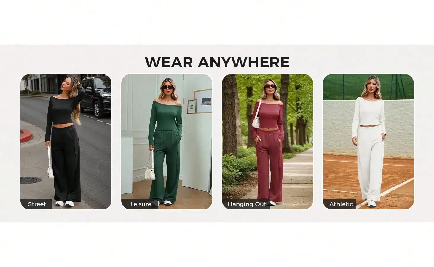 Fabric: This women's 2 piece lounge sets is made of soft and skin-friendly fabric, comfortable and breathable, suitable for spring and autumn wear Features: Lounge Sets for Women/ Casual Two Piece Outfits/ Off The Shoulder Long Sleeve Crop Tops/ Elastic Waisted Wide Leg Pants/ Spring Fall Fashion/ Womens Tracksuits/ Sweatsuits Sets for Women/ Matching Outfits/ Comfy Pajamas Set/ Travel Clothes Match: The tracksuit are ideal for casual wear, home wear, active wear, running, sleepwear, vacation, daily wear, jogging, yoga etc; Easy to pair with sneakers, sandals or flats Occasion: This two piece outfits adopt sports casual style, very suitable for daily leisure, going out, home, work, vacation and travel; It can also be used as sportswear for yoga, fitness, running, hiking Wash Instruction: Machine wash with cold water, similar color washing, hang dry, do not bleach; ( If you use hand wash, the clothes will be more durable )