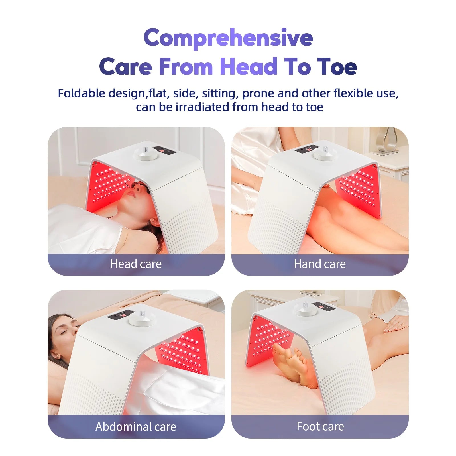 5. Complete care from head to toe.Foldable design,flat, side, sitting, prone and other flexible use, can be irradiated from head to toe.