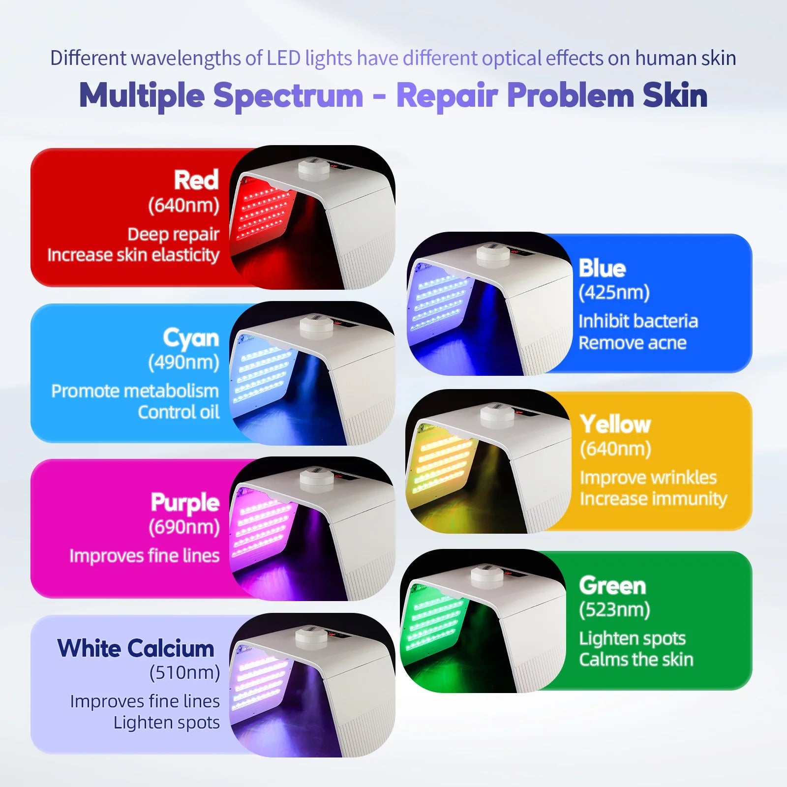 4. Multi-spectrum - repair problem skin.Different wavelengths of LED lights have different optical effects on human skin.