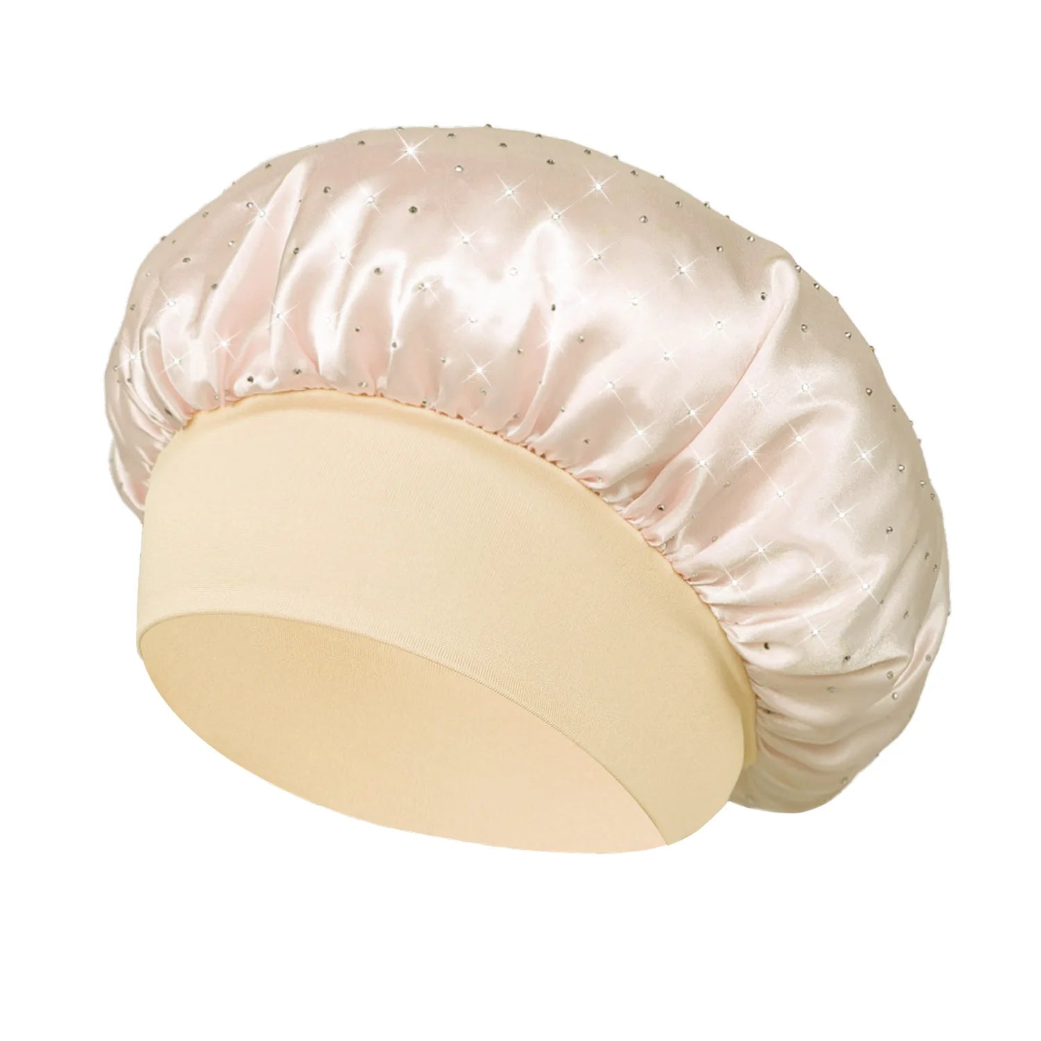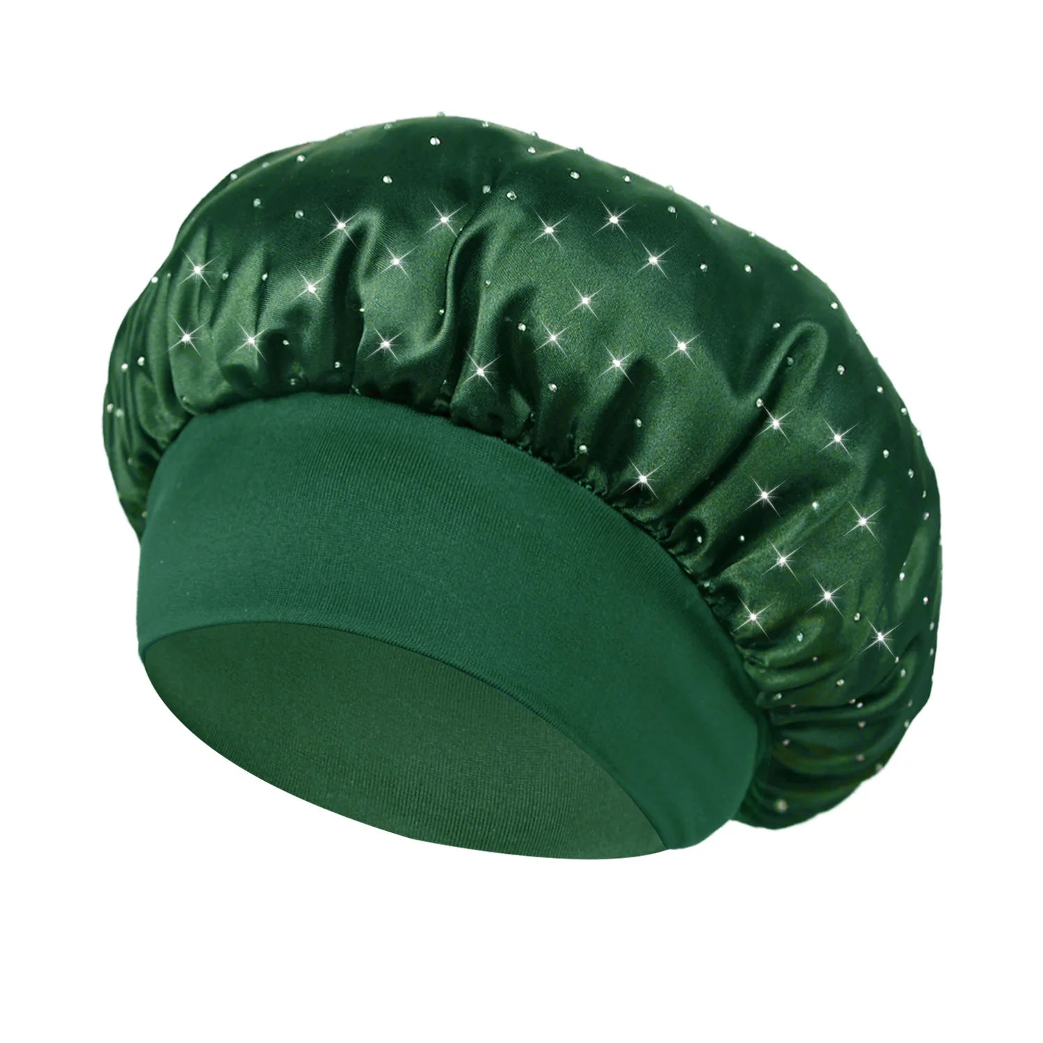 Elevate your nighttime routine with KYDZSWCN's satin rhinestone sleep bonnet, a chic, comfortable headwrap that stays in place all night.