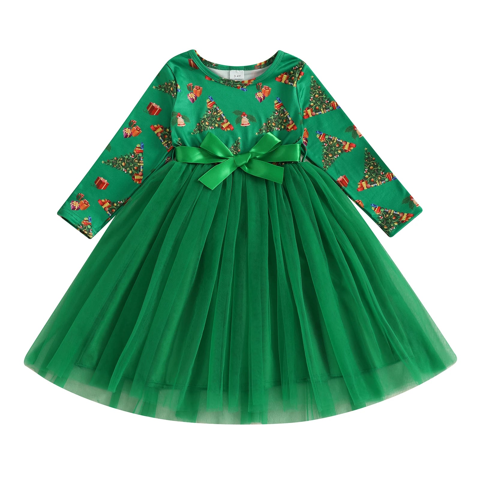 Christmas baby clothes; Girls ball gown with Christmas elements print, mesh patchwork, long sleeves, round neckline, A-line, with belt design, make your little one a princess on the prom night