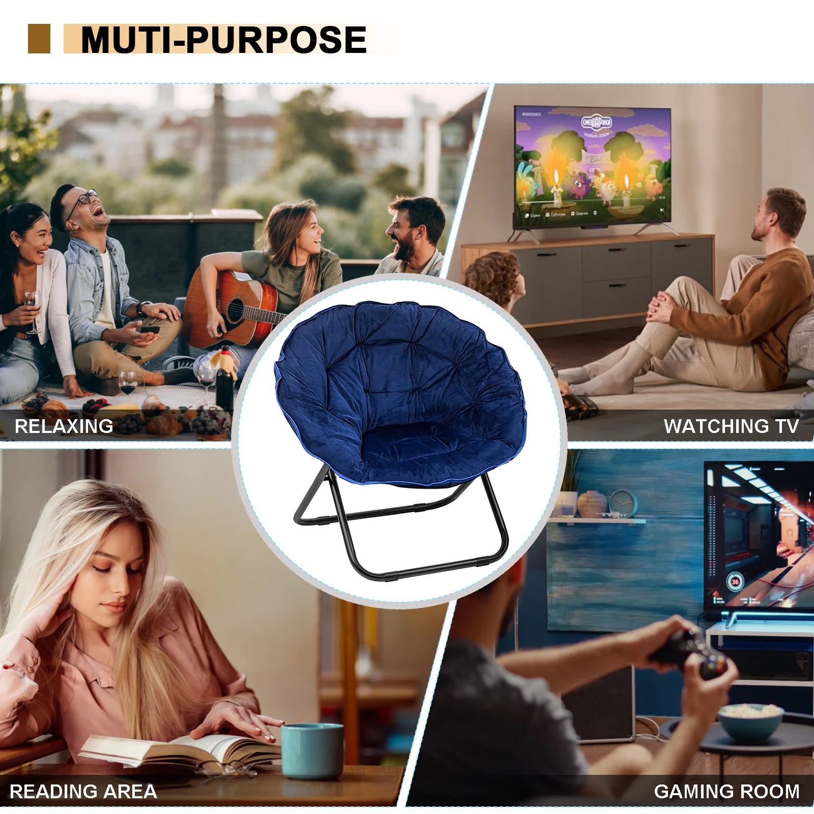 Grezone Round Foldable Saucer Chair Moon Chair With Metal Frame