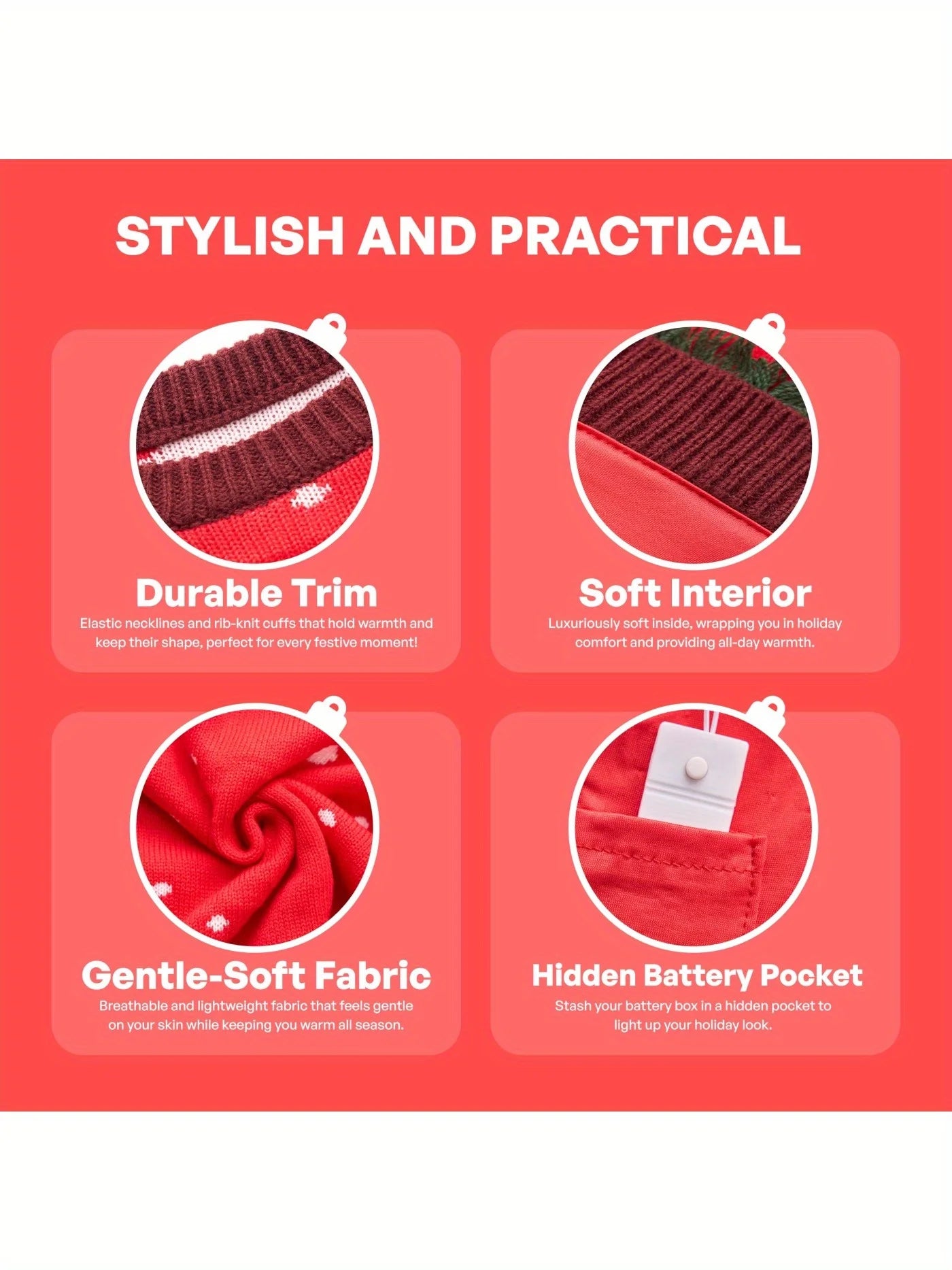 UNIQUE AND FESTIVE. This Red ugly Christmas sweater is sure to draw a crowd at your kid next holiday party. Featuring blinking lights on the Ornaments. This gaudy masterpiece will definitely get a few laughs from your friends and family. Celebrate the Holiday atmosphere in these fantastic holiday sweaters!