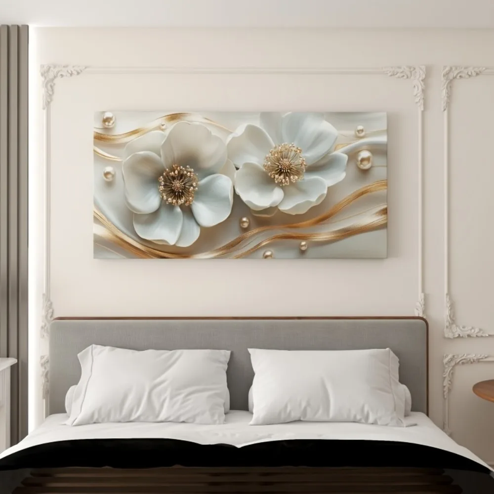 Modern abstract white floral canvas wall art with gold embellishments - elegant interior with 1.5 inch thick pine frame