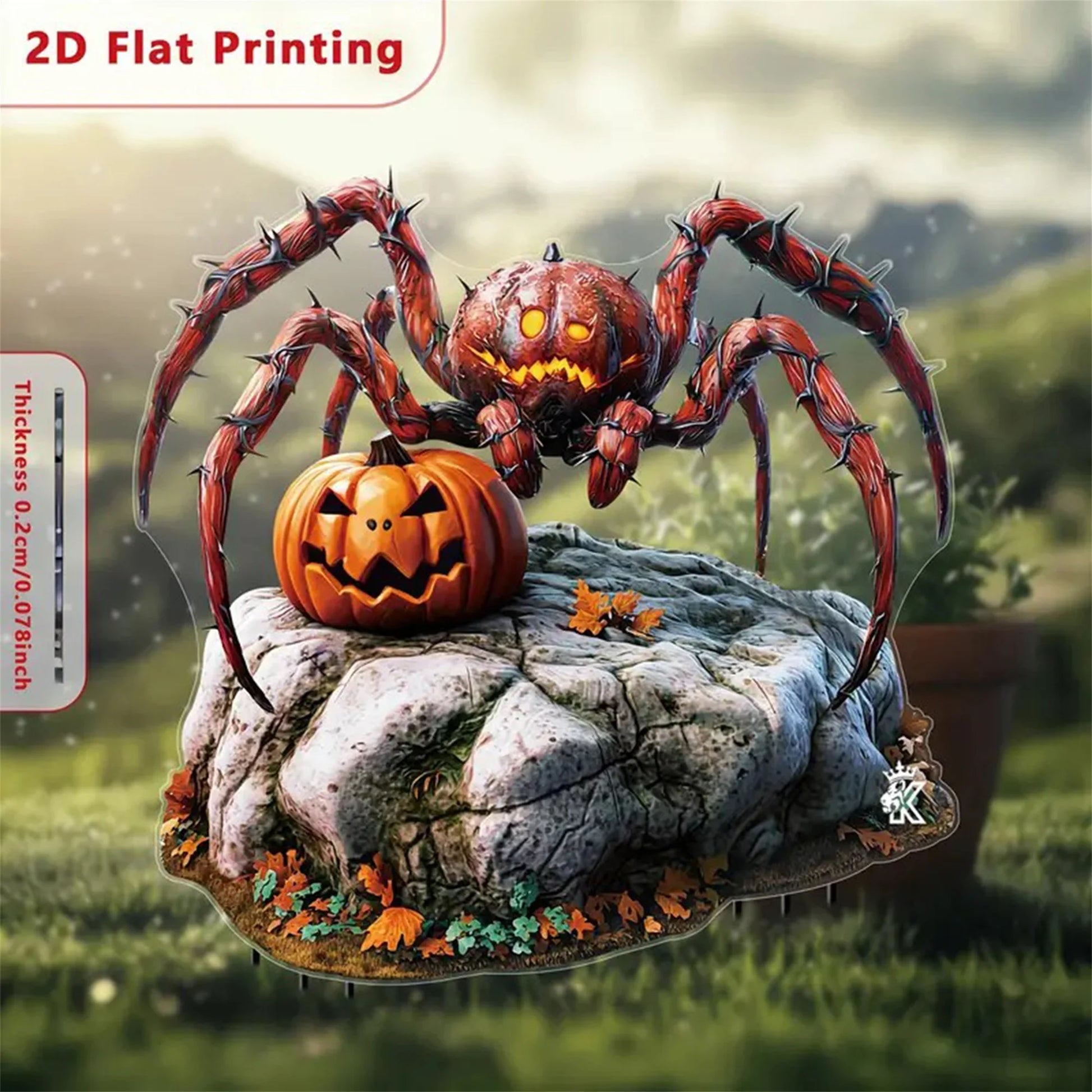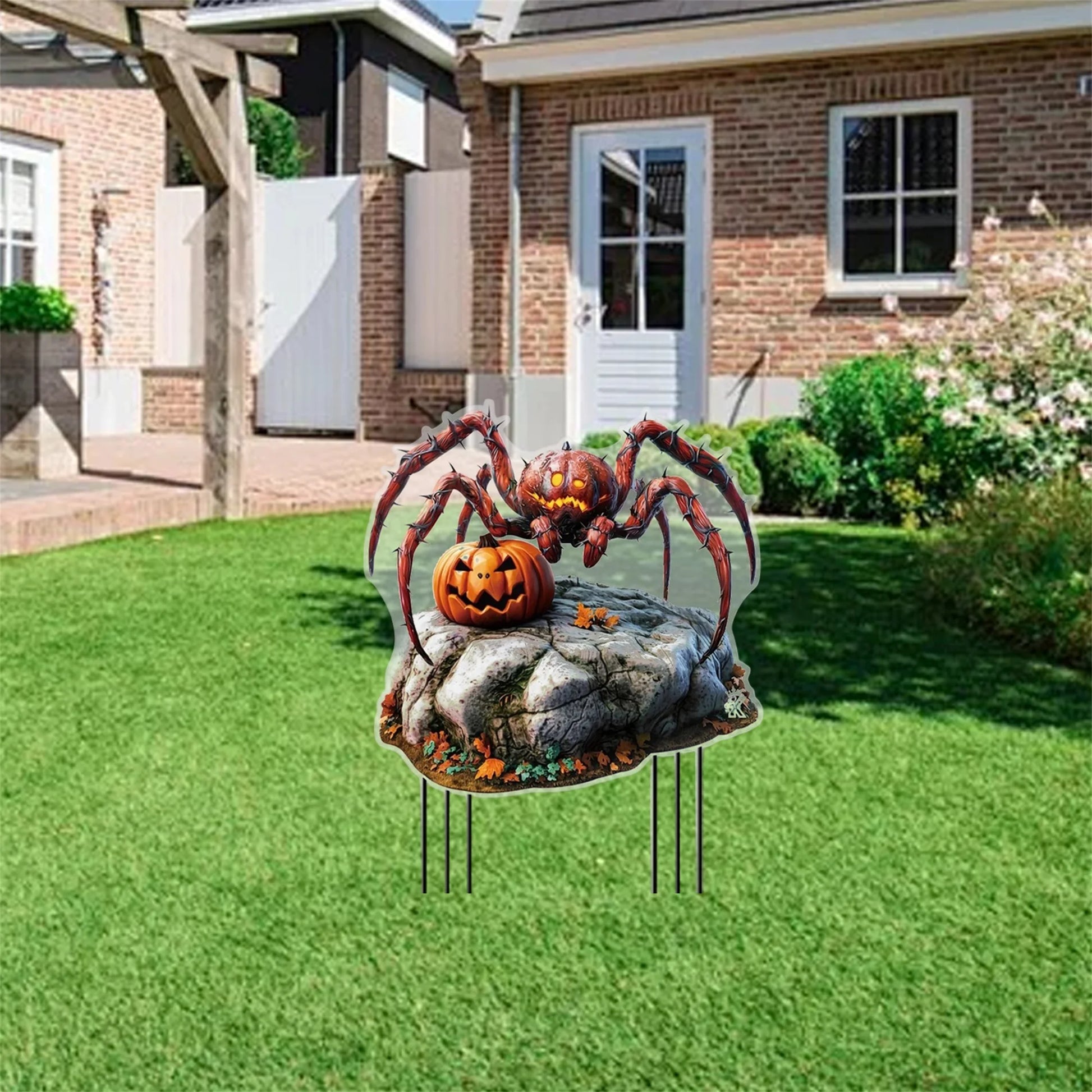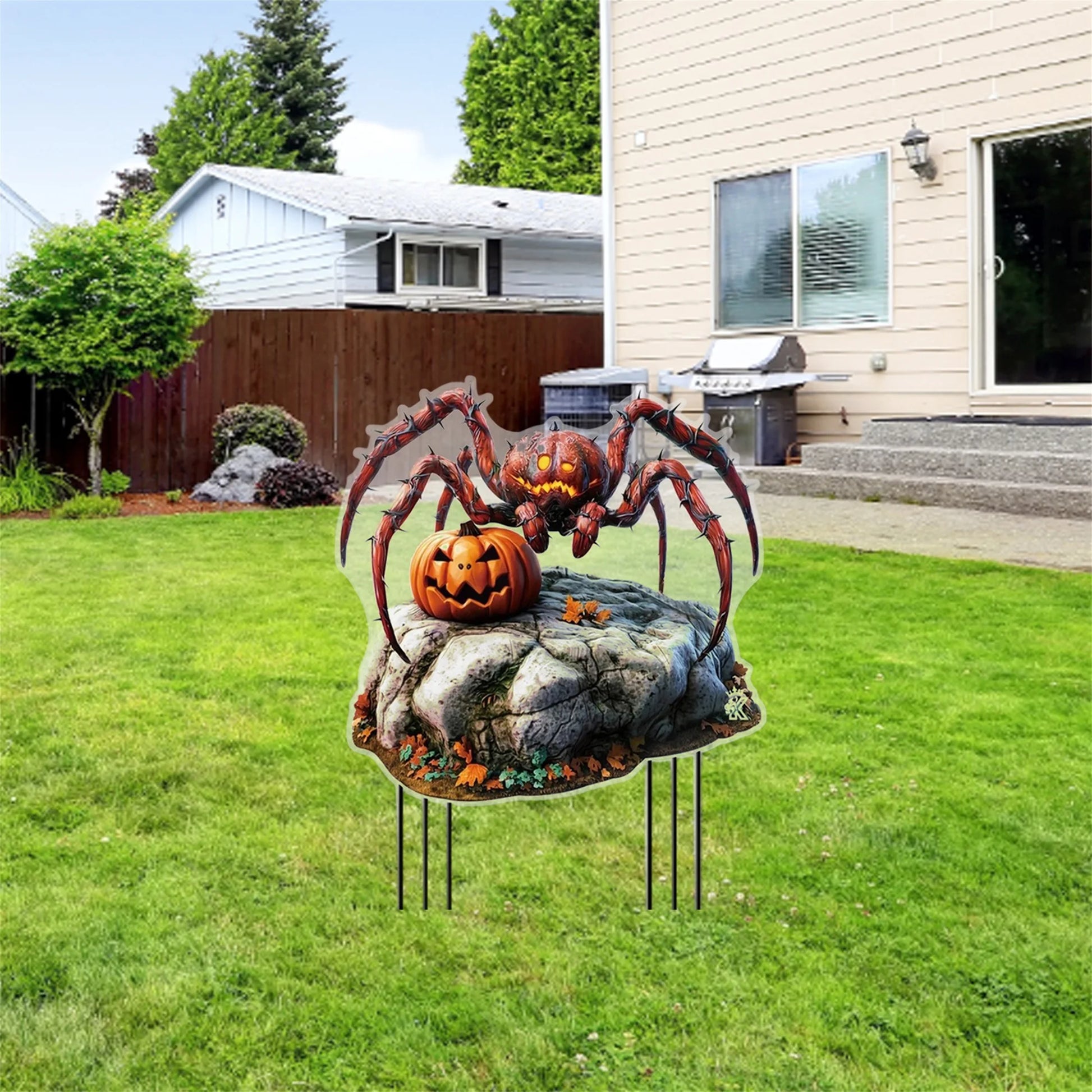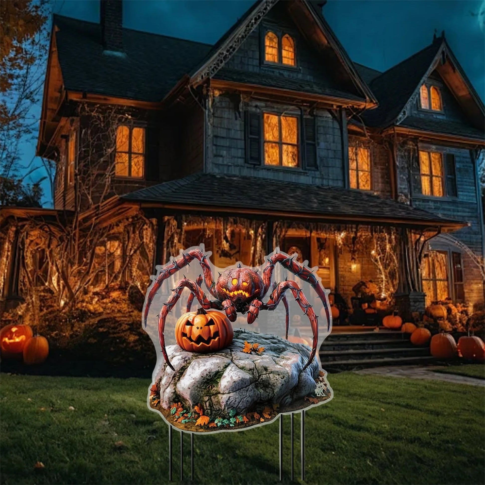 - 2D flat Spider Pumpkin pattern in vibrant yellow creates a playful, eye-catching contrast against foliage, lighting, and evening skies.