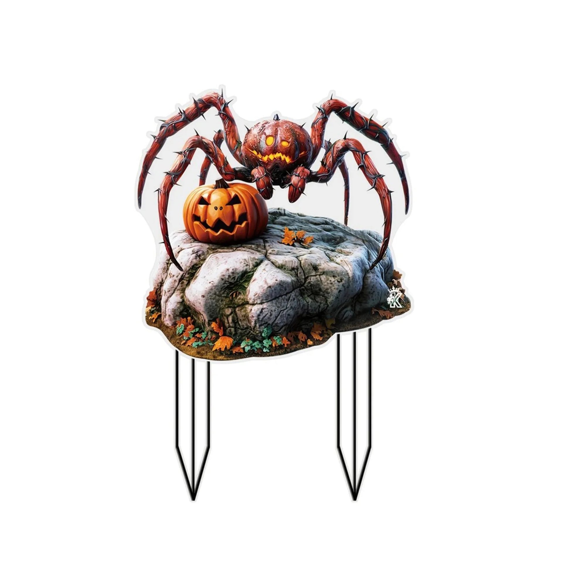 Create a spooky, customized Halloween focal point in your yard with this Ghost Bat garden stake, featuring a bright yellow 2D flat Spider Pumpkin motif.