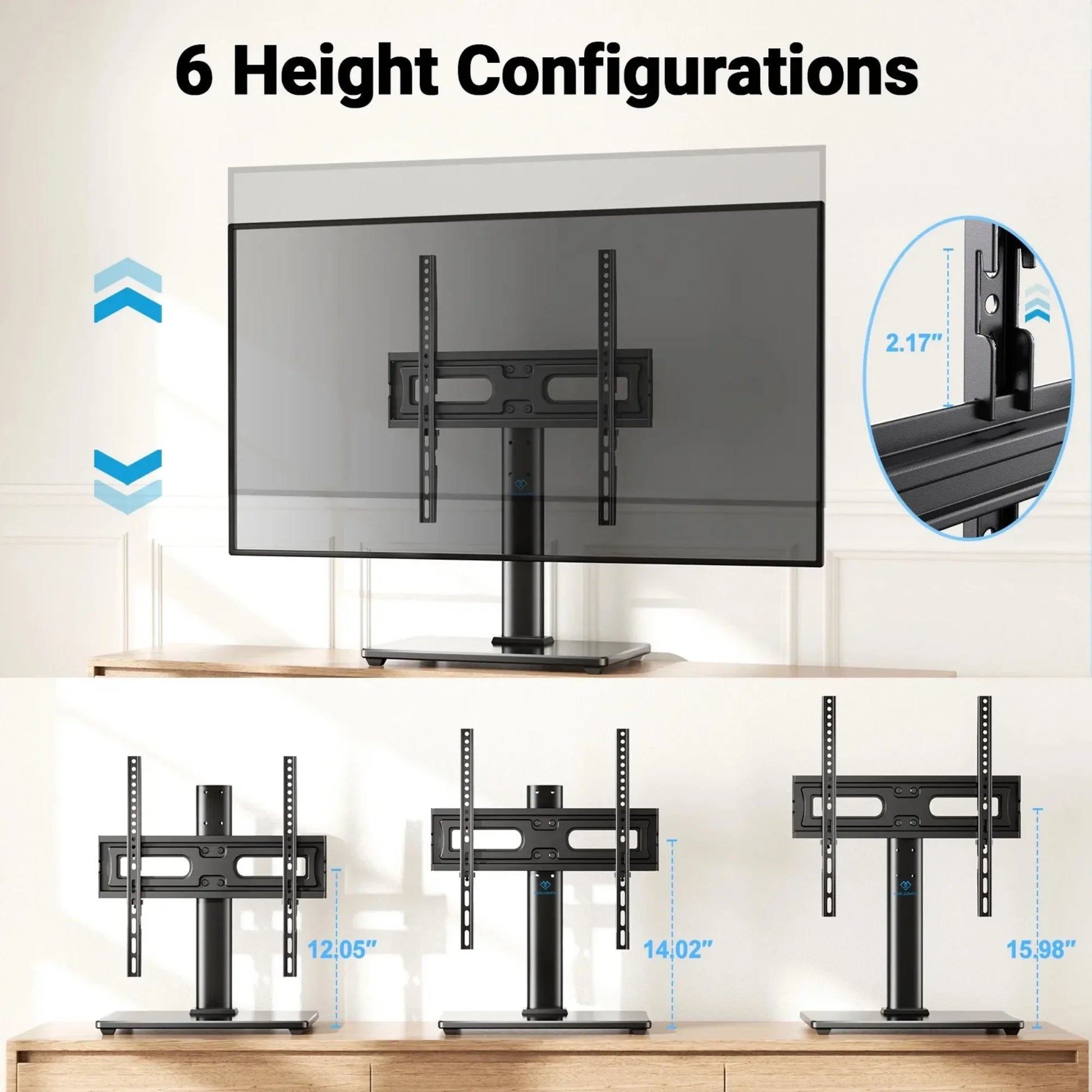 - Six height positions provide precise placement for a comfortable, eye-level view on most TV models, with smooth adjustment and secure locking.