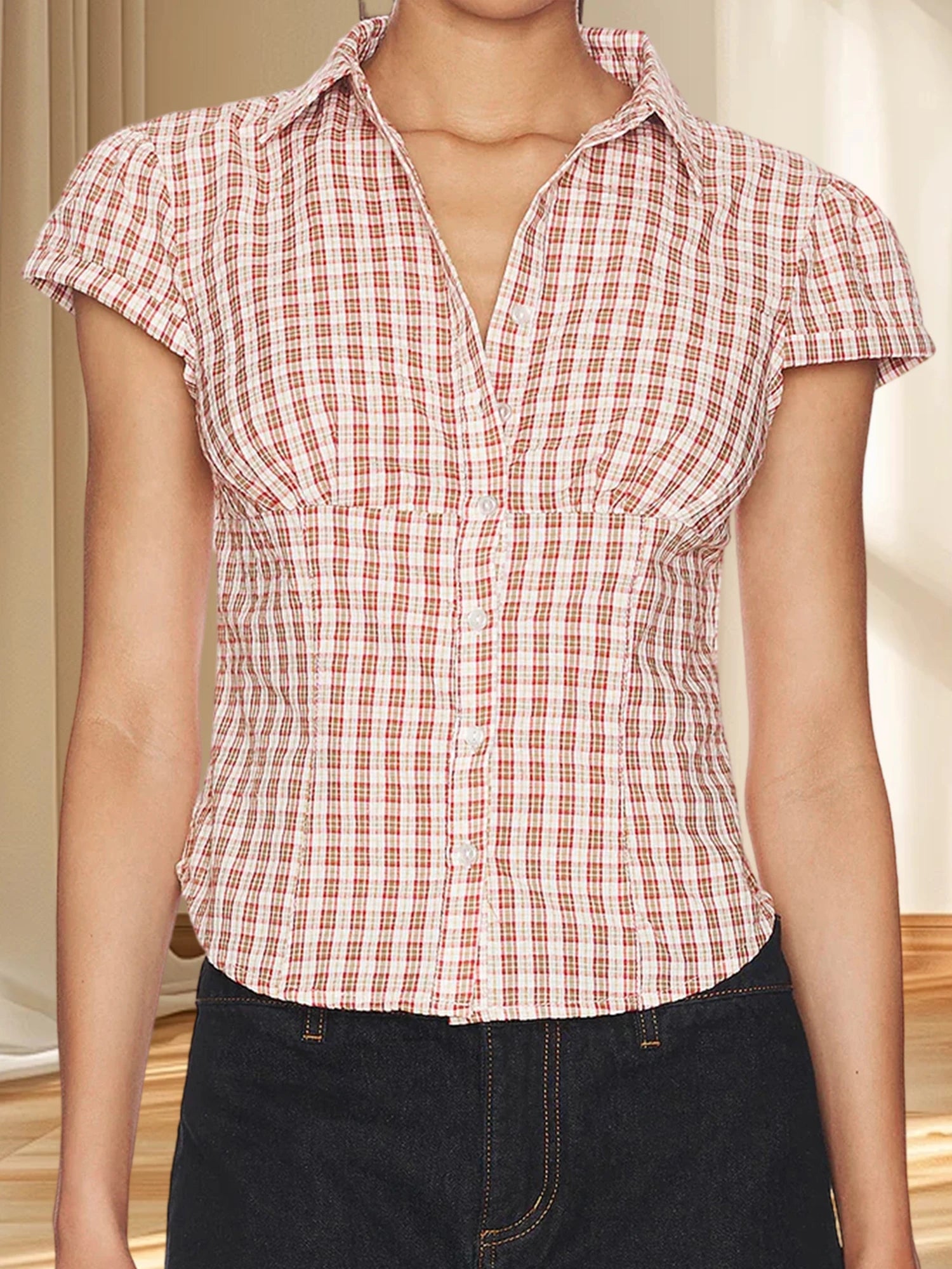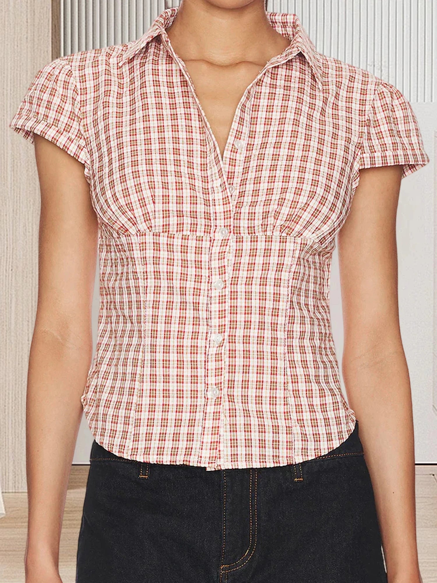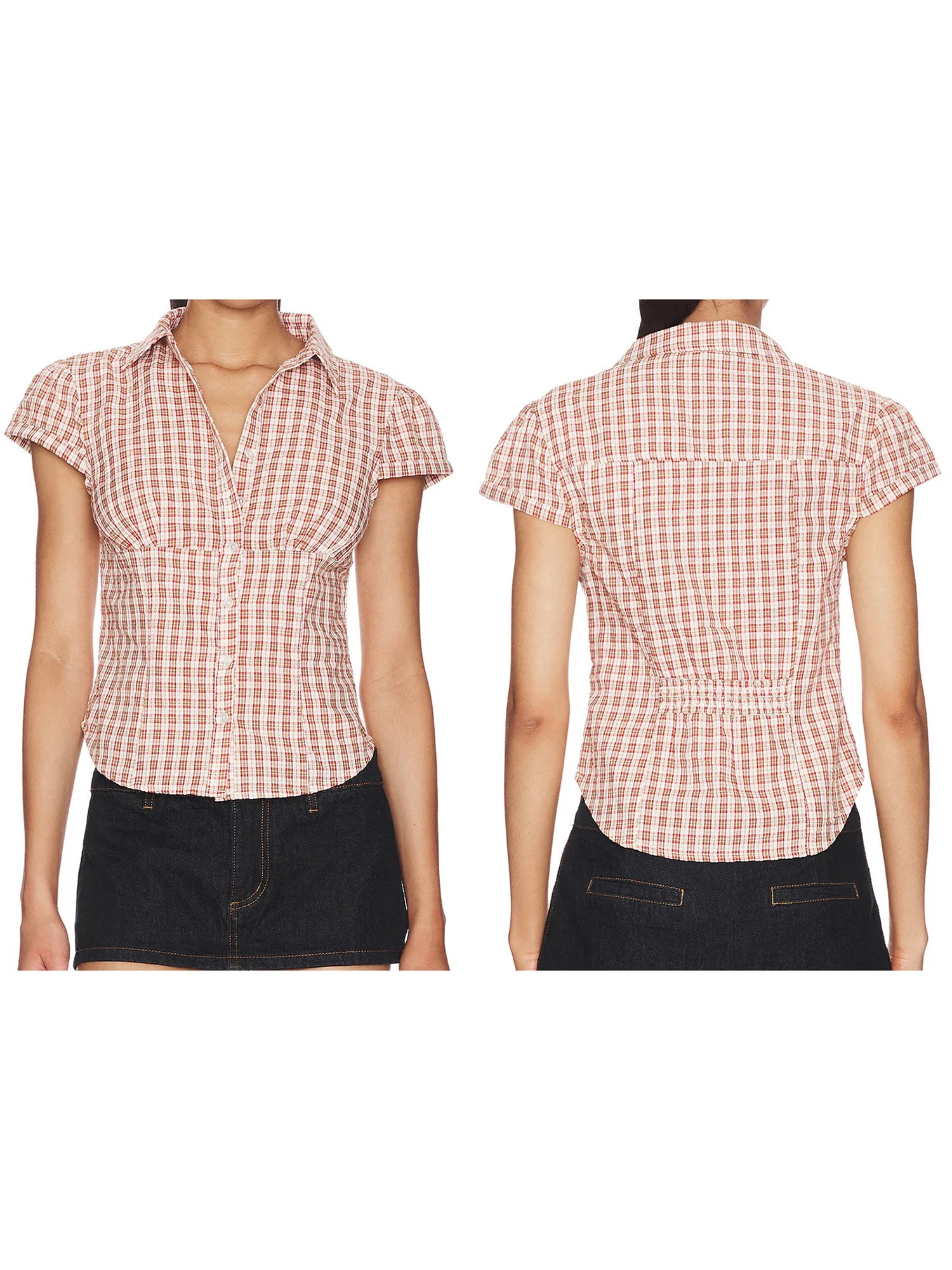 Women Plaid Shirt, Short Sleeve Button Closure Summer Tops Streetwear for Casual DailySize (cm)