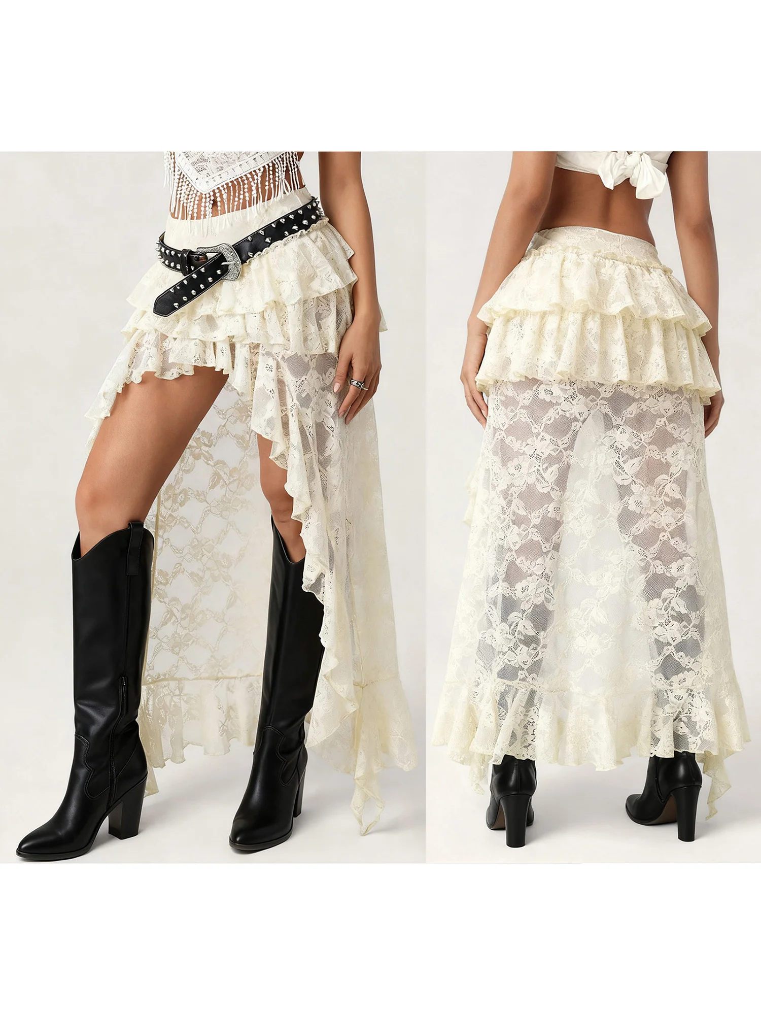 Women Flower Lace Skirt Elastic Waist High Low Layered Ruffle Skirt Casual Summer Streetwear