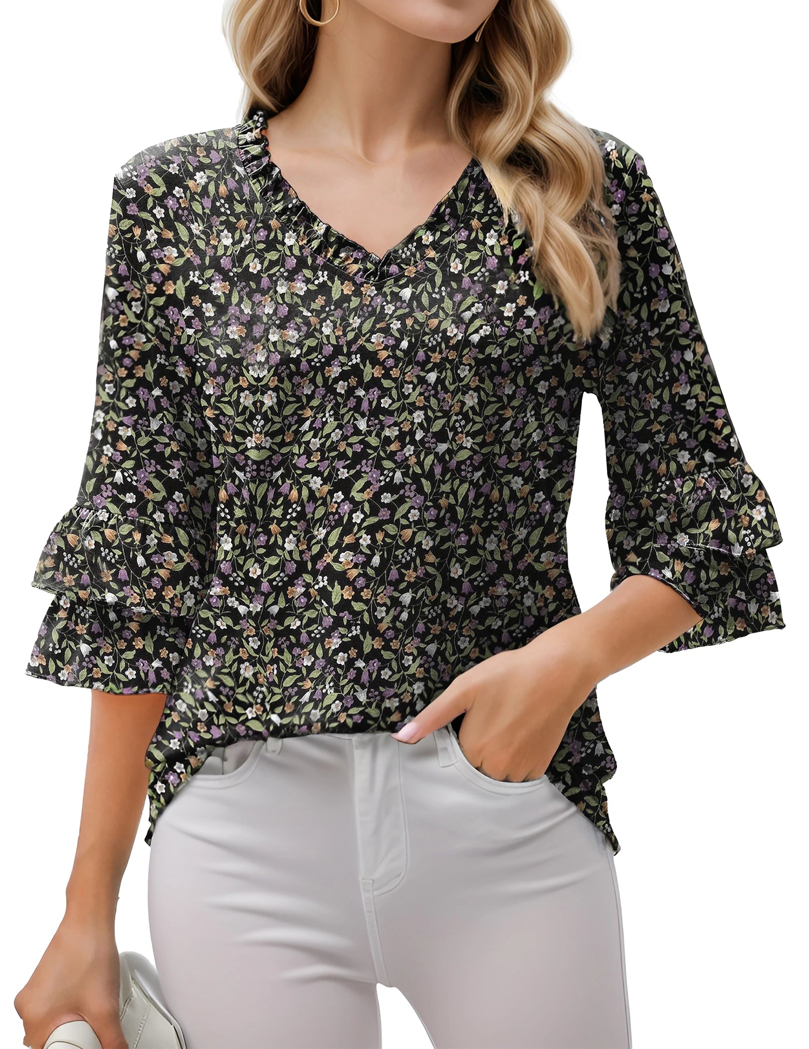 Womens Casual V Neck 3/4 Bell Sleeve Tops Frill Neck Tiered Ruffle Sleeve Loose Blouses