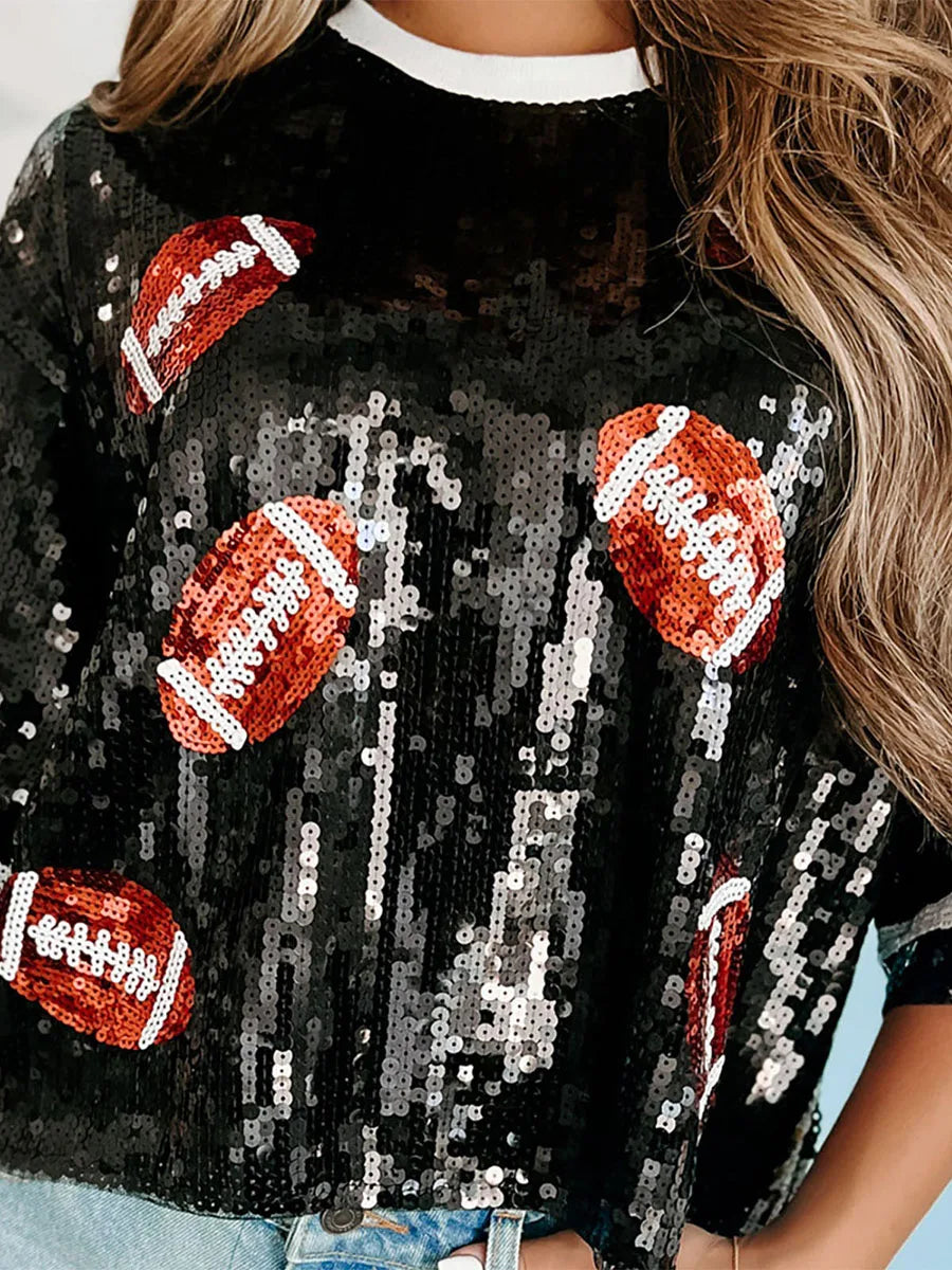 Womens Summer Fashion Sequins T-shirt Short Sleeve Crewneck Rugby Print Tops for Party